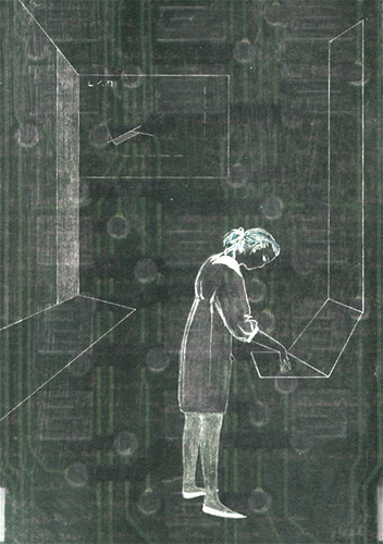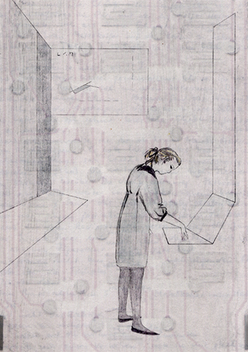 Siddra stand vor einem hohen papierweißen Kunststoffbrett, auf dem sich dünne Linien bewegten; es war Tains Monitor.
