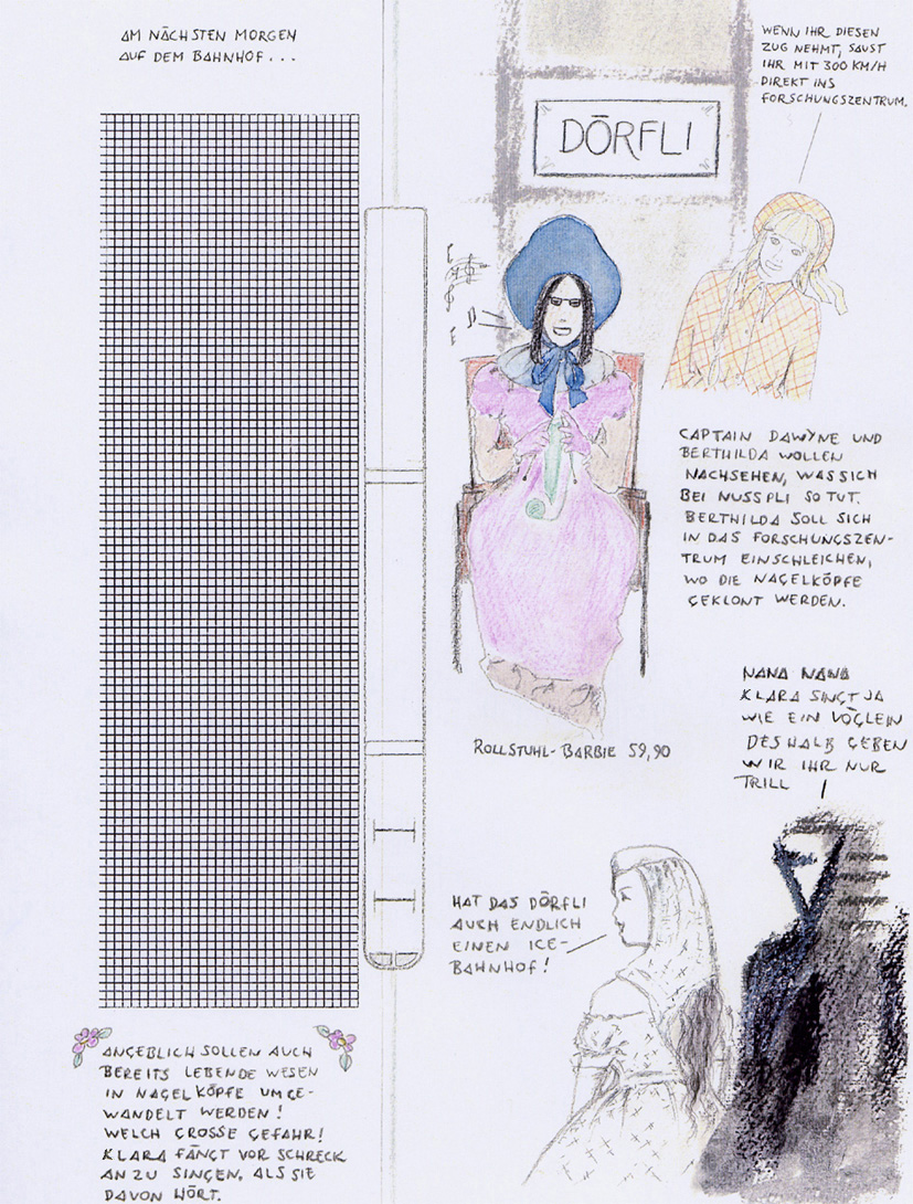 Berthilda und Captain Dawyne machen sich am nächsten Morgen auf den Weg. Berthilda soll sich in "Plienis" (oder "Nussplis") Forschungszentrum mit scheinbarem Kaufinteresse die Nagelköpfe vorführen lassen. Captain Dawyne plant, einem Mitarbeiter des Forschungszentrums scheinbar Datenverarbeitungssysteme anzubieten und währenddessen heimlich "Nussplis" Datenspeicher zu überspielen. Heidi und Klara begleiten Berthilda und Captain Dawyne zum ICE-Bahnhof von Dörfli.