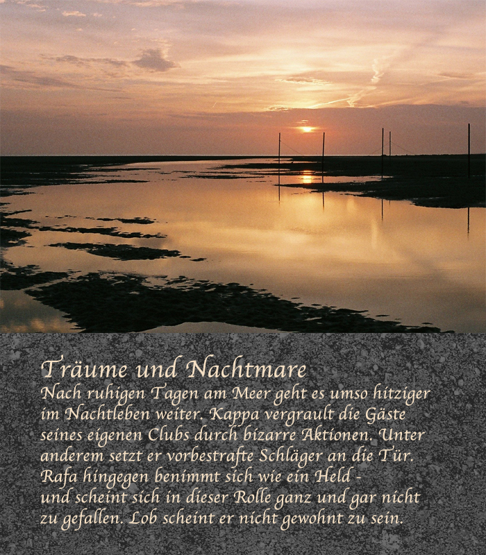 "Dann wird es Zeit, daß er Prioritäten setzt", rate ich. "Der kann nicht alles auf einmal. Der sollte dem "Nachtlicht" erstmal Priorität einräumen, weil der Laden neu ist und da die ganze Szene mit drinhängt."