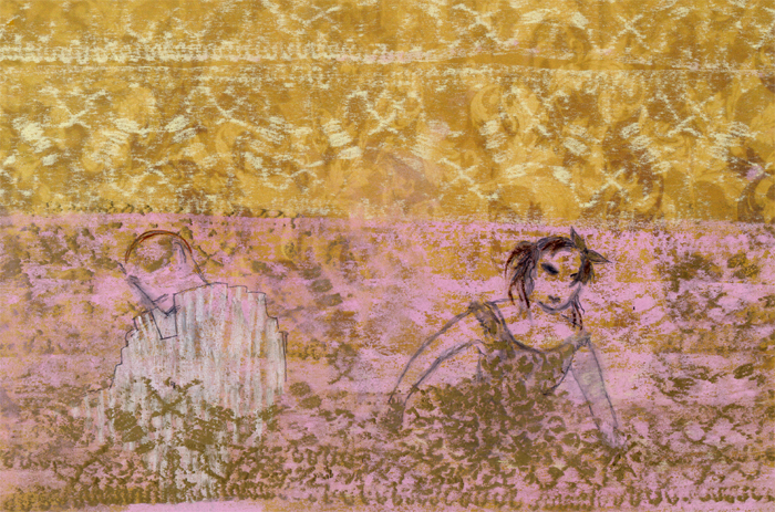 Deirdra schloß das Doppelzimmer mit der Nummer -849 auf, das ebenso fensterlos war wie alle Zimmer in den unterirdischen Stockwerken. Drinnen schimmerte weiches Licht wie Goldstaub über dem Bett. Deirdra ließ sich auf die kunstseidene Überdecke fallen. Hauro nahm auf dem Hochflor-Teppichboden Platz und zeichnete mit Kreide auf eine graue Pappe, die in einer von Deirdras Einkaufstüten gewesen war.